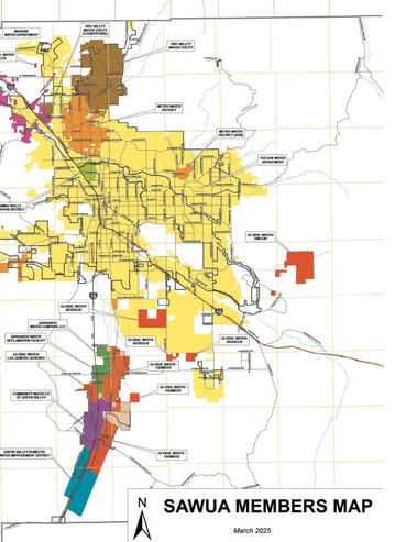 The Southern Arizona Water Users Association (SAWUA) is comprised of 15 members including the largest water providers in the Tucson region, wastewater reclamation entities, and agricultural water users. SAWUA member agencies have water management authority to provide municipal water and wastewater service to over 900,000 residents in the Santa Cruz River Basin. Collectively, SAWUA delivers almost 200,000 acre-feet per year of potable water and treats over 64,000 acre-feet of wastewater annually.